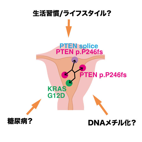 子宮内で、同じ起源のがん細胞クローンがPTENやKRASの異常を獲得しながら広がることを明らかにしました。一方で、発がんや進展の過程に生活習慣や糖尿病、DNAメチル化がどのように関わるのかは今後の課題です。