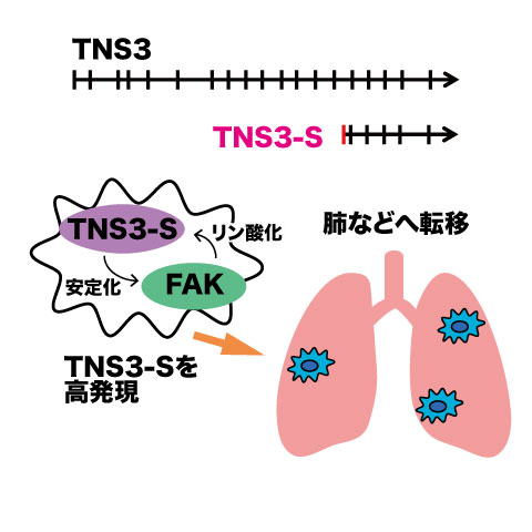 転移しやすい乳がん細胞で多く作られるTNS3-Sという分子を特定し、TNS3-SがFAKを安定させることで、肺でのがん細胞の生き残りと増殖を助けることを示しました。TNS3-Sが転移の早期発見マーカーや治療標的になり得るか検証を進める予定です。