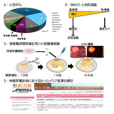 (A)神経芽腫は脳腫瘍に次いで発症する小児固形腫瘍で、小児がんの6.5%を占める。(B)自然退縮機構を知る為に、鍵分子BMCC1の機能解明を進める。(C)受精鶏卵漿尿膜上に神経芽腫細胞を移植し、腫瘍を形成させる実験系を機能解析研究に導入した。(D)神経芽腫症例が保有するmtDNA 変異についてJNBSGと共同で網羅的に解析中である。