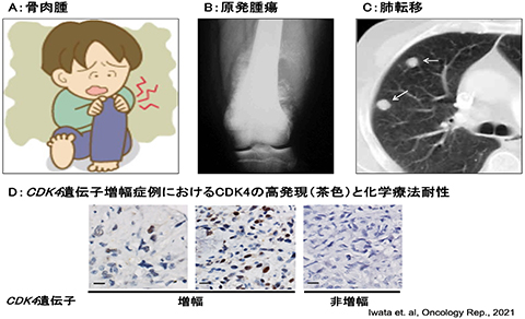 (A)骨肉腫は小児からAdolescent and Young Adult (AYA)世代にかけて大腿骨や上腕骨など四肢の骨端部に好発する代表的な骨腫瘍である。原発腫瘍(B)の網羅的解析から、肺転移症例(C)の特徴ならびに化学療法抵抗性を持つ症例の特徴である(D)CDK4遺伝子増幅に伴うCDK4の過剰発現(免疫組織染色)が見えてきた。現在はこれら特徴を標的とした難治病態に対する治療戦略を探索中である。