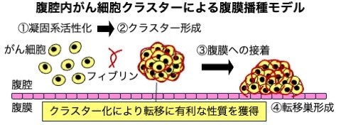 腹腔内がん細胞クラスターによる腹膜播種モデル。がん細胞は腹腔内において血液凝固系を活性化しフィブリン繊維形成を誘導します(1)。がん細胞はフィブリン繊維に絡まるようにしてクラスターを形成します(2)。がん細胞クラスターはフィブリン繊維を介して腹膜へ接着し増殖することで転移巣を形成します(3)(4)。私たちはがん細胞のクラスター形成に伴う性質変化に着目し、腹膜播種の分子機構の解析および新規治療標的の探索を行なっています。