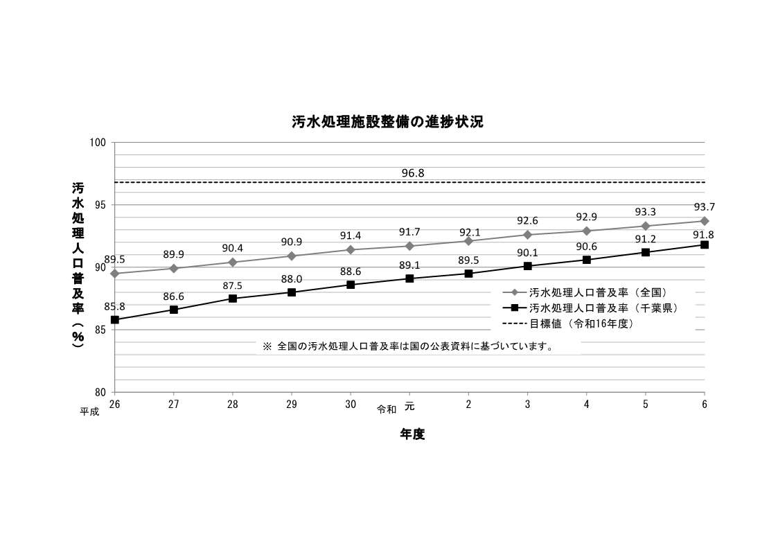 千葉県では、住み良いまち、きれいな水を未来に残すため、「千葉県全県域汚水適正処理構想」を平成8年度に策定し、その後、3回の見直しを行い、下水道、集落排水、合併処理浄化槽等の各汚水処理施設の整備を推進してきました。