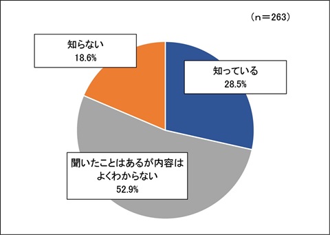 配偶者からの暴力の防止及び被害者の保護等に関する法律を知っているかたずねたところ、『聞いたことはあるが内容はよくわからない』が52.9%と最も多く、次いで『知っている』が28.5%でした。