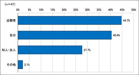 そのような行為を受けたのはどなたかたずねたところ、『近親者』が44.7%と最も多く、次いで『自分』が40.4%、『知人・友人』が27.7%でした。