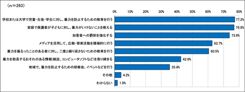 DV、デートDVを防止するためにはどのようなことが必要だと思うかたずねたところ、『学校または大学で児童・生徒・学生に対し、暴力を防止するための教育を行う』が77.2%と最も多く、次いで 『家庭で保護者が子どもに対し、暴力がいけないことを教える』が76.8%、『加害者への罰則を強化する』が73.8%でした。