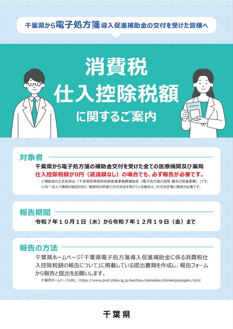 ホーム > くらし・福祉・健康 > 健康・医療 > 保健医療政策 > 千葉県における健康福祉の取組と医療費の見通しに関する計画(医療費適正化計画) > 千葉県電子処方箋導入促進補助金について > 千葉県電子処方箋導入促進補助金に係る消費税仕入控除税額の報告について