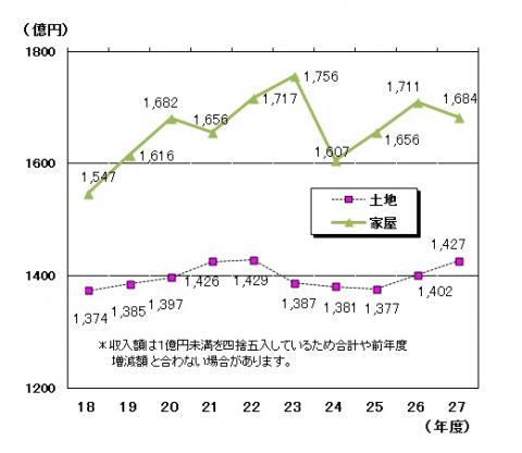 市町村税の収入額は、平成20年度から平成24年度にかけて4年連続で減少していましたが、平成25年度に増加に転じ、平成27年度も引き続き、個人所得の増加や固定資産税の税収増などにより、前年度と比較して0.1%増の9,739億円となりました。