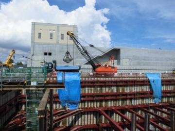 地盤を掘削するための土留めとして、セメント・水などを練り混ぜたスラリーと土を地中内で混合・撹拌して、連続地中壁を築造しています。地中内の壁の高さは、約40mになります。