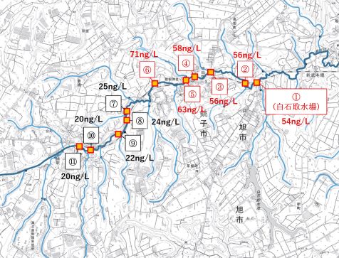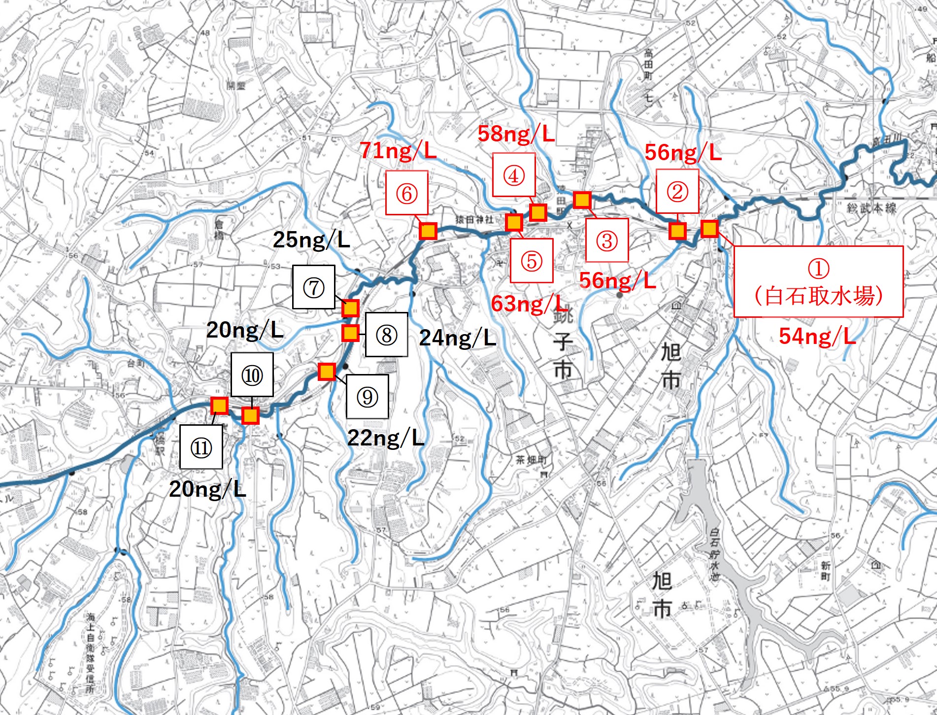 銚子市と旭市を流れる高田川では、PFOS及びPFOAの合計値が、国が定める指針値を継続的に超過しています。