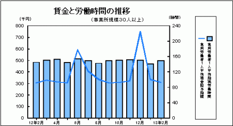 (2)平成13年2月の常用労働者1人平均総実労働時間は,調査産業計で 148.9時間(前年同月比 2.4%増)となった。