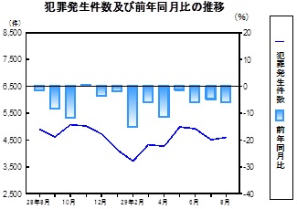平成29年8月の犯罪発生件数は4,594件で前月比は1.9%増加、前年同月比は6.2%減少しました。