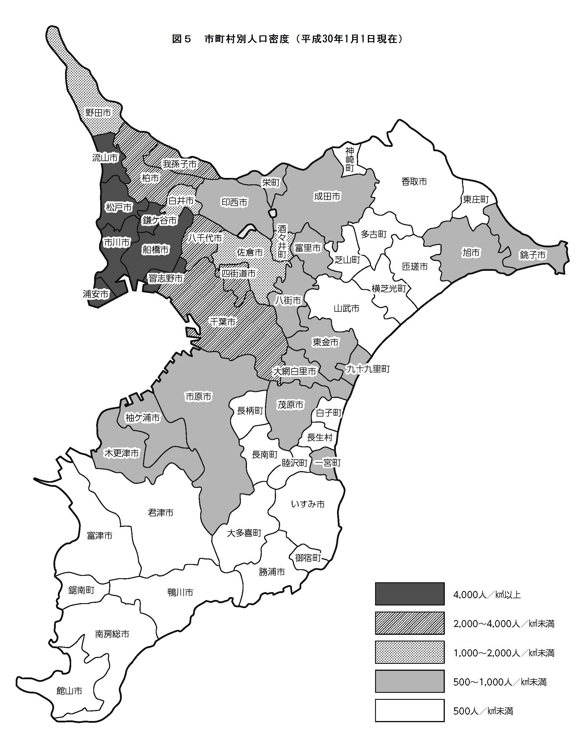 平成30年1月1日現在の県人口を市町村別にみると、市部(37市)のうち10万人以上の市は16市あり、そのうち千葉市が975,535人(県人口に占める割合15.6%)で最も多く、郡部人口204,507人(同3.3%)の約4.8倍となっている。以下、船橋市632,241人(同10.1%)、市川市490,052人(同7.8%)、松戸市488,706人(同7.8%)、柏市421,600人(同6.7%)の順で続き、この5市で県人口の48.1%を占めている。