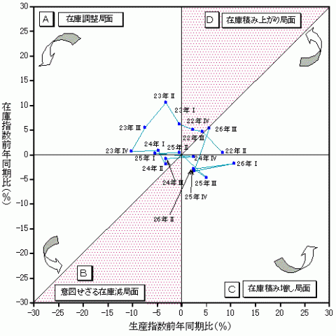 B.意図せざる在庫減局面・・・・・需要が回復し始めるが,生産は停滞しており,在庫が減少する。(景気拡大初期)