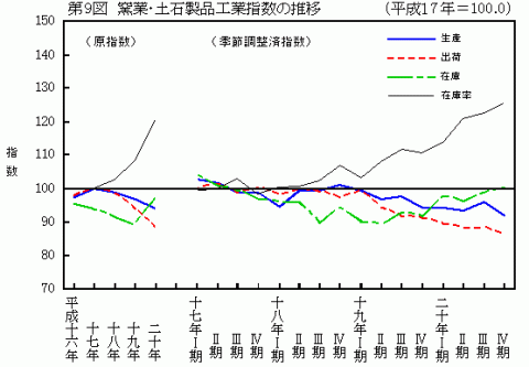 平成20年の石油・石炭製品工業は,生産指数が101.6で前年比1.7%上昇,出荷指数が99.0で同0.3%上昇,在庫指数が101.7で同0.7%上昇,在庫率指数が154.5で同21.3%上昇しました。