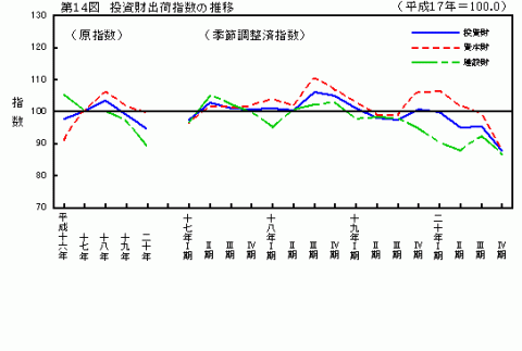 平成20年の投資財の出荷指数は94.6で前年比△4.5%低下し,資本財が同△2.0%低下,建設財が同△7.8%低下しました。
