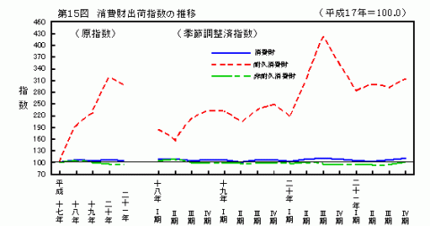 平成21年の消費財の出荷指数は105.3で前年比△1.7%低下し,耐久消費財は同△7.1%低下,非耐久消費財は同△0.8%低下しました。