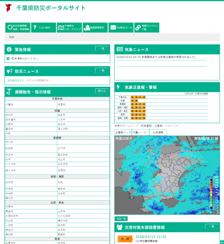 防災情報システムによって市町村から県庁に報告された避難情報や避難所開設情報などは、千葉県防災ポータルサイトで公開されます。ポータルサイトではこのほかにも、警報、注意報等の気象情報、地震情報や、災害対策に役立つ防災まめ知識、ハザードマップ、地震被害想定などの情報を掲載しています。