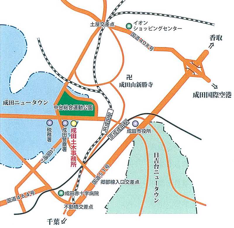 - 佐原方面から国道51号寺台インター交差点を右折し国道408号(空港通り)へ土屋交差点を左折し公園通りへ、成田警察署前交差点を左折し200m先右側。