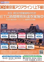 東京湾アクアラインでは、土曜日・日曜日・祝日の特定の時間帯に交通が集中することによって激しい混雑が発生していることから、交通需要の偏在等による混雑の緩和を図るため、土曜日・日曜日・祝日のアクアライン上り線(木更津→川崎方面)及び下り線(川崎→木更津方面)において、特定の時間帯の割引料金を変動させるETC時間帯別料金の社会実験を実施しています。