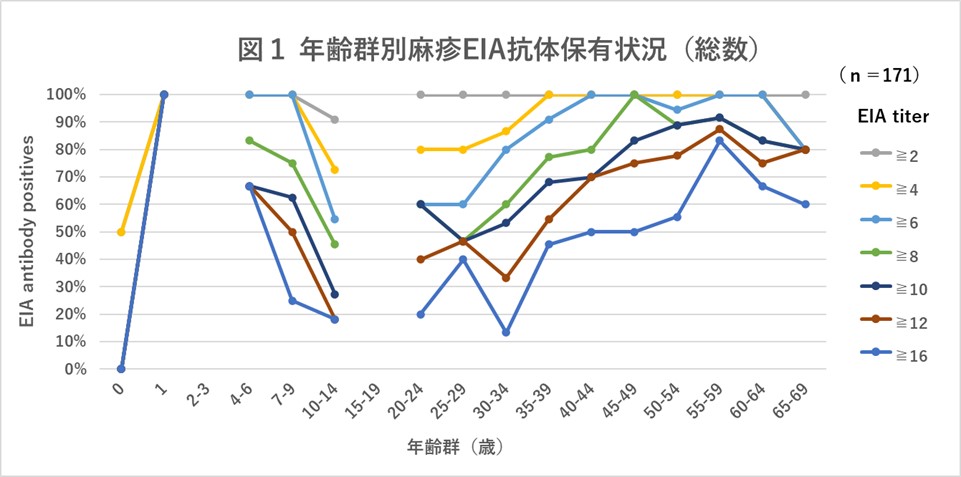 0歳から67歳までの171名を対象とし、酵素抗体法(Enzyme immunoassay:EIA法)を用いて血清中のEIA抗体(IgG)保有状況を調査した。