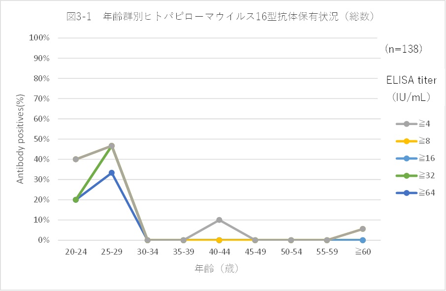 20歳から67歳までの138名(女性33名、男性105名)を対象とし、HPV16型に対するIgG抗体保有状況をELISA法で調査した。