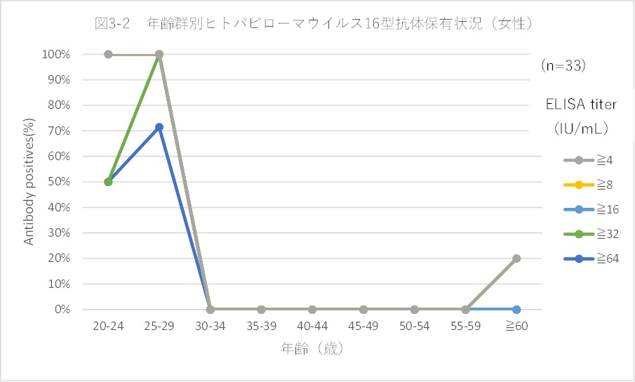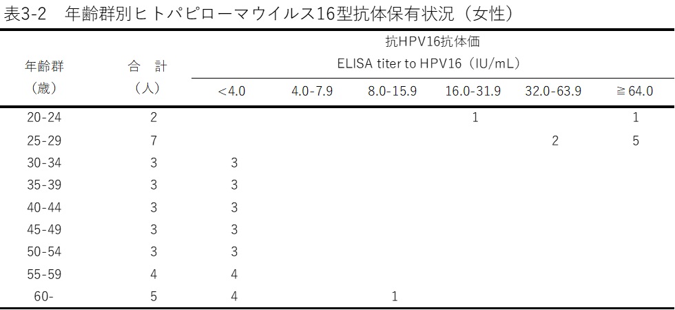 表3-2 年齢群別ヒトパピローマウイルス16型抗体保有状況(女性)