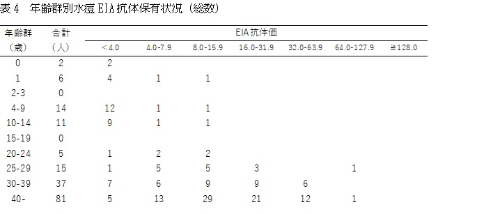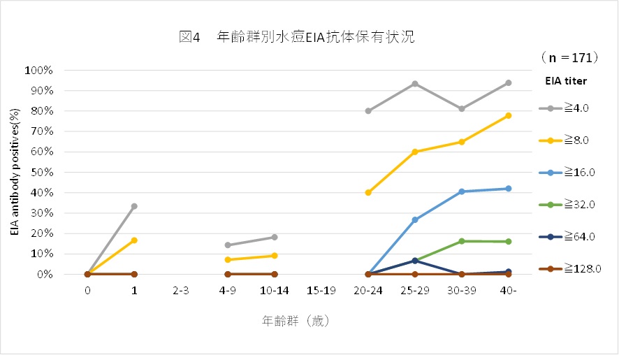 判定基準において抗体陽性と判断されるEIA価4.0以上の割合は、調査対象として得られなかった2-3歳群と15-19歳群を除き、0歳群、1歳群、4-9歳群、10-14歳群でそれぞれ0%、33.3%、14.3%、18.2%であった。同年齢群(0歳を除く)でEIA価4.0未満であった25名のうち21名は1回以上ワクチン接種をしており、ワクチン接種による獲得免疫が持続していない結果となった。20歳以上の年齢群では、80%以上の抗体陽性率という結果となった。小児の調査対象数が他の年齢群と比較して少ないため、その傾向を判断するのは難しいが、年齢とともにEIA価4.0以上の抗体保有率は増加することが確認された。