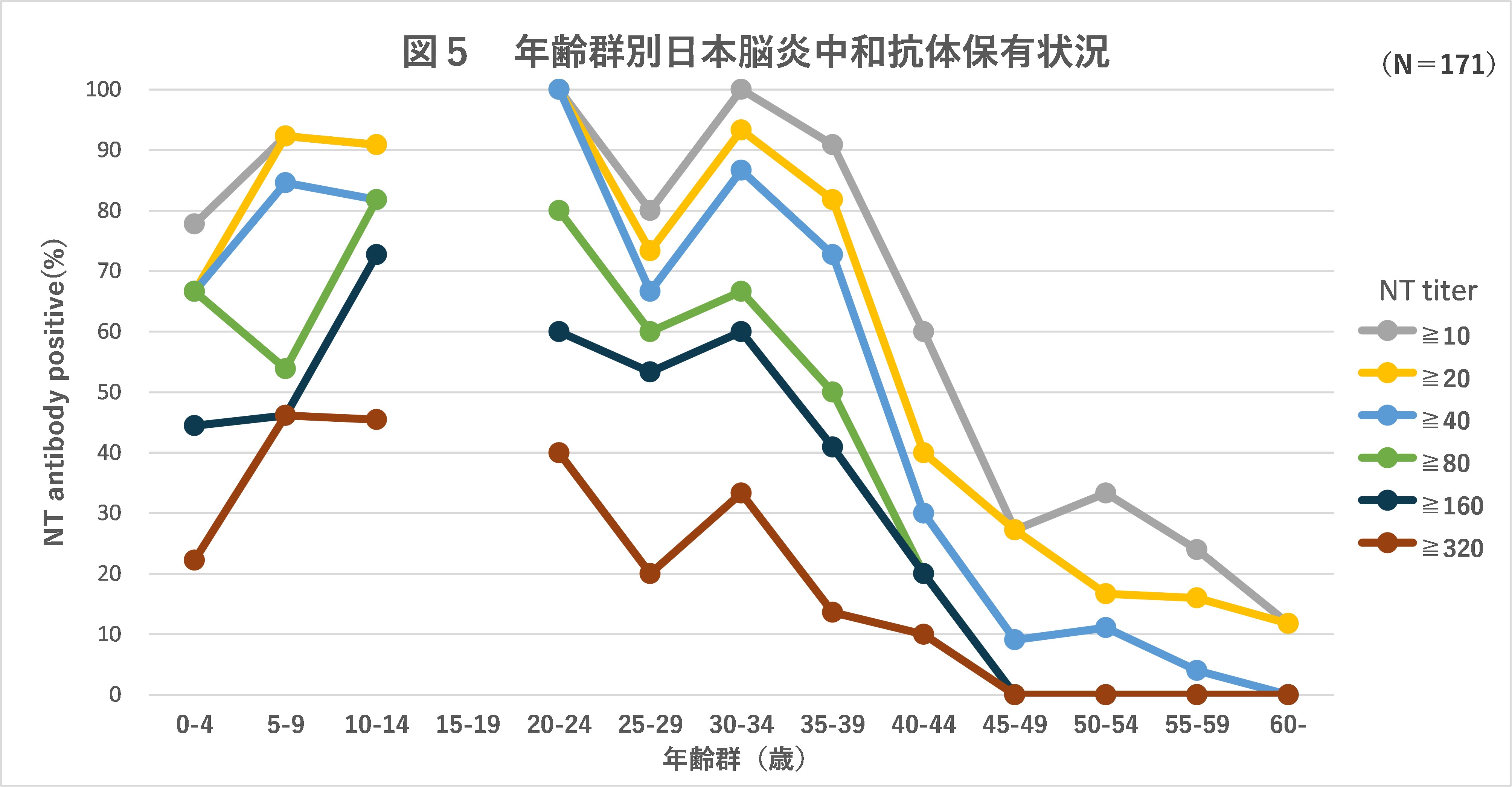 今回の調査では、ワクチン未接種は171名中8名であり、ワクチン未接種にもかかわらず8名中5名が抗体を保有していた。抗体保有5名のうち2名が生後6か月未満の乳児で移行抗体の可能性が考えられた。乳児2名を除いた3名の抗体保有者は日本脳炎ウイルスに感染した既往を持つ可能性が示唆されたが、罹患歴は無く、不顕性感染の可能性が考えられた。