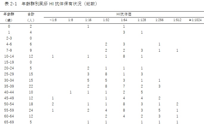 0歳から67歳までの171名(女性46名、男性125名)を対象とし、赤血球凝集抑制法(Hemagglutination Inhibition test:HI法)を用いて対象者血清中のHI抗体保有状況を調査した。