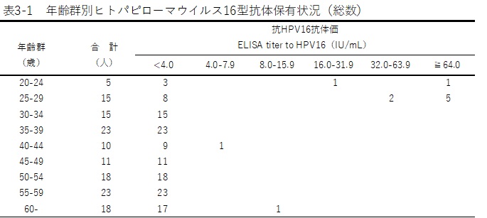 表3-1 年齢群別ヒトパピローマウイルス16型抗体保有状況(総数)