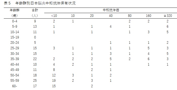 18歳から30歳の年齢層は、日本脳炎ワクチン接種勧奨差し控えの時期に接種対象となっており、21名中3名が抗体を保有していなかった(14.3%)。この年齢群については、接種歴の詳細について不明な方が多く、接種の有無や回数との関係性は不明であった。