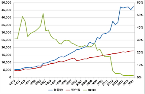 図2.1975年以降の千葉県におけるがん登録数、死亡数、DCO(Death Certificate Only)%の推移