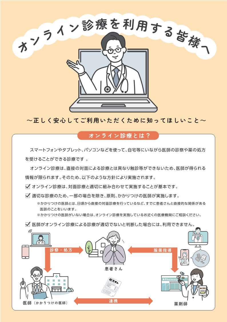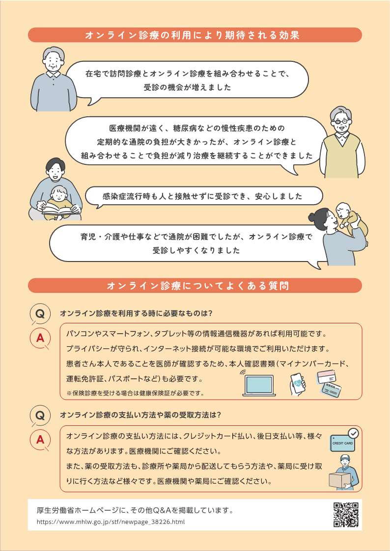 ダウンロートはこちら(「オンライン診療を利用する皆様へ」(PDF:1,171.3KB)(厚生労働省作成リーフレット))