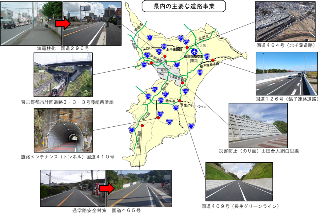 本県では、アクアラインと一体となり首都圏を連絡する圏央道や、外環道と成田国際空港を最短で結ぶ北千葉道路などの広域的な幹線道路ネットワークの整備を促進するとともに、幹線道路から各地域へアクセスする道路や、県境において橋梁の整備を推進するほか、様々な国道・県道などの地域に密着した道路について、拡幅やバイパスなどの改築工事を実施しています。
