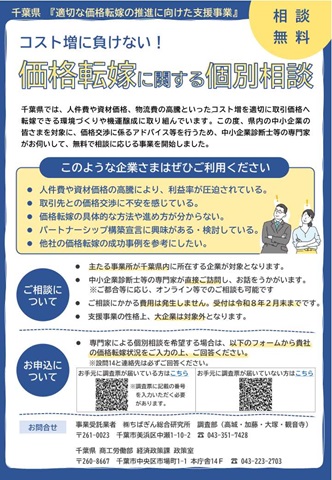 県では、適切な価格転嫁の推進に向けて、「専門家派遣による価格転嫁や交渉の相談支援」「価格転嫁に関するセミナーの開催」「価格交渉に役立つ好事例集の作成」を実施しています。