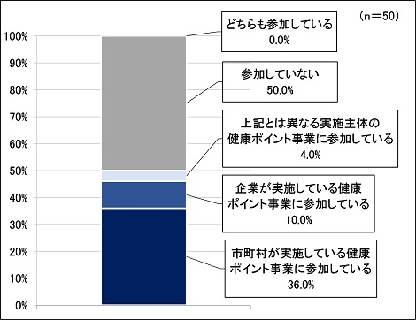 健康ポイント事業への参加状況についてたずねたところ、『参加していない』が50.0%と最も多く、次いで『市町村が実施している健康ポイント事業に参加している』が36.0%でした。