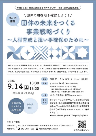 ホーム > くらし・福祉・健康 > くらし > NPO・ボランティア > 千葉県NPO・ボランティア情報ネット > NPO向けお役立ち情報 > 市民活動団体マネジメント事業 > 団体の未来をつくる事業戦略づくり(9月14日開催)の参加者を募集します