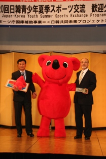 チーバくんも韓国選手団を歓迎(17日、歓迎夕食会)