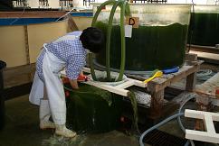 収穫水槽に集められたワムシを水中ポンプで吸い上げ、網でこし取って収穫します。