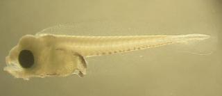 ふ化当日、全長2.2mmの仔魚。口はまだ開いていません。
