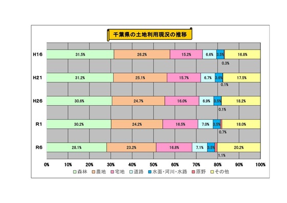 「令和7年度土地利用現況把握調査」(調査時点:令和6年10月1日現在)の結果、県内の土地利用の現況は、森林が28.1%、農地が23.2%、宅地等(宅地、道路、水面・河川・水路の合計)が27.4%であり、概ね、森林・農地・宅地等の面積値が均衡する状況となっています。