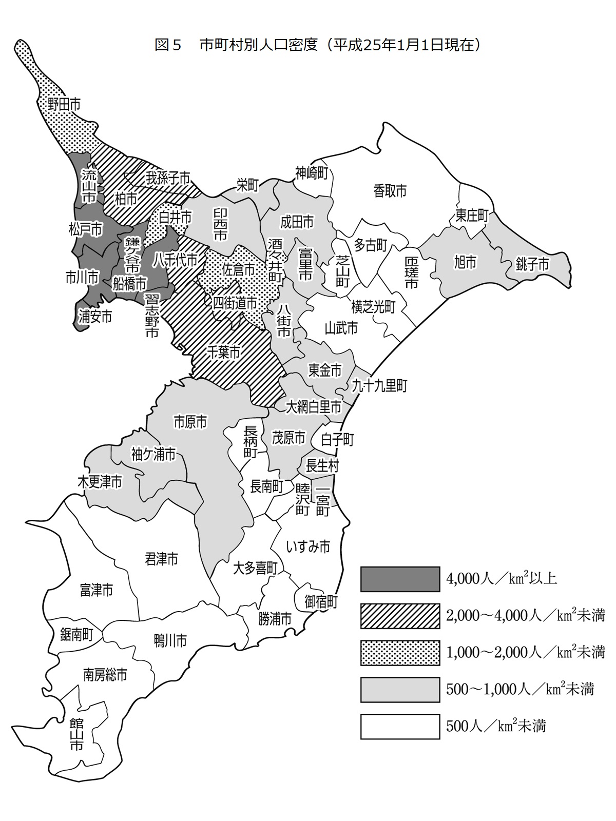 平成25年1月1日現在の県人口を市町村別にみると、市部(37市)のうち10万人以上の市は16市あり、そのうち千葉市が963,682人(県人口に占める割合15.6%)で最も多く、郡部人口216,889人(同3.5%)の約4.4倍となっている。以下、船橋市612,657人(同9.9%)、松戸市480,294人(同7.8%)、市川市468,566人(同7.6%)、柏市404,838人(同6.5%)の順で続き、この5市で県人口の47.3%を占めている。