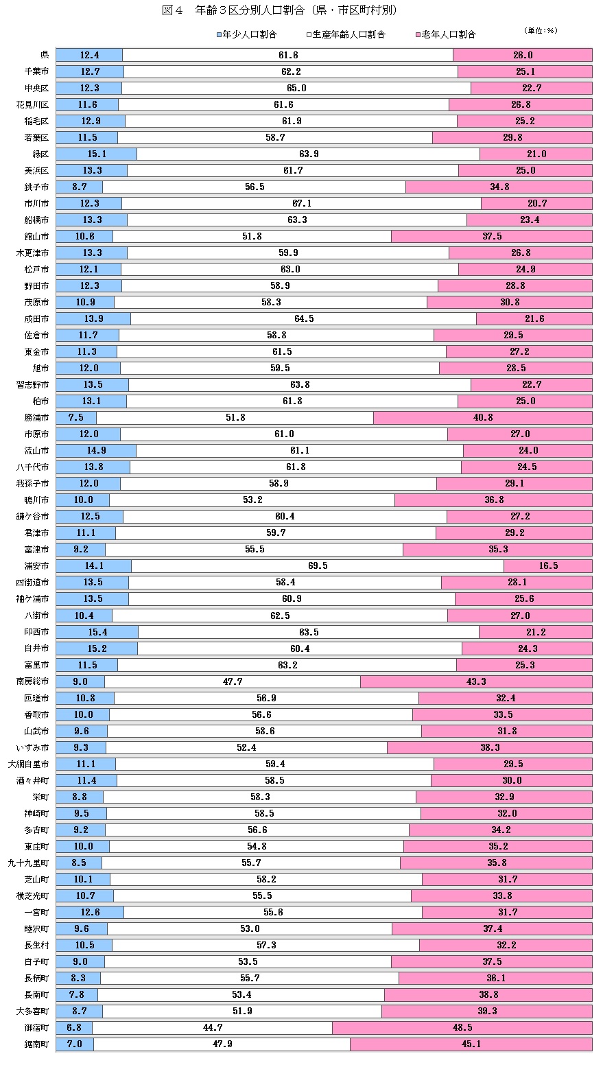 年少人口割合が最も高いのは、葛南地域の12.9%で、次いで、印旛地域の12.8%、東葛飾地域の12.7%となっている。なお、年少人口割合が最も低いのは夷隅地域の8.4%である。