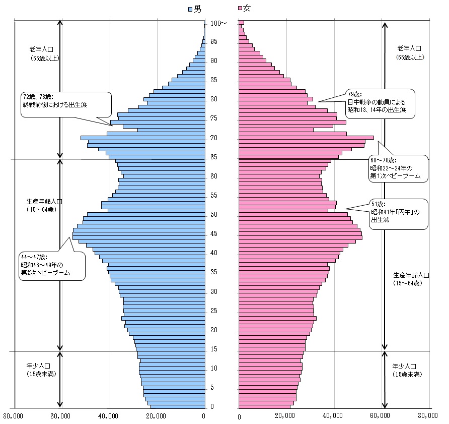 年齢各歳別人口で最も人口が多いのは、第1次ベビーブーム世代に当たる70歳の108,892人で、次いで、第2次ベビーブーム世代となる44歳の107,268人となっている。(図6)